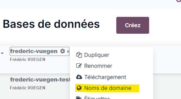 - Sur la page de vos bases de données, vous pouvez définir les noms de domaine redirigés vers cette base