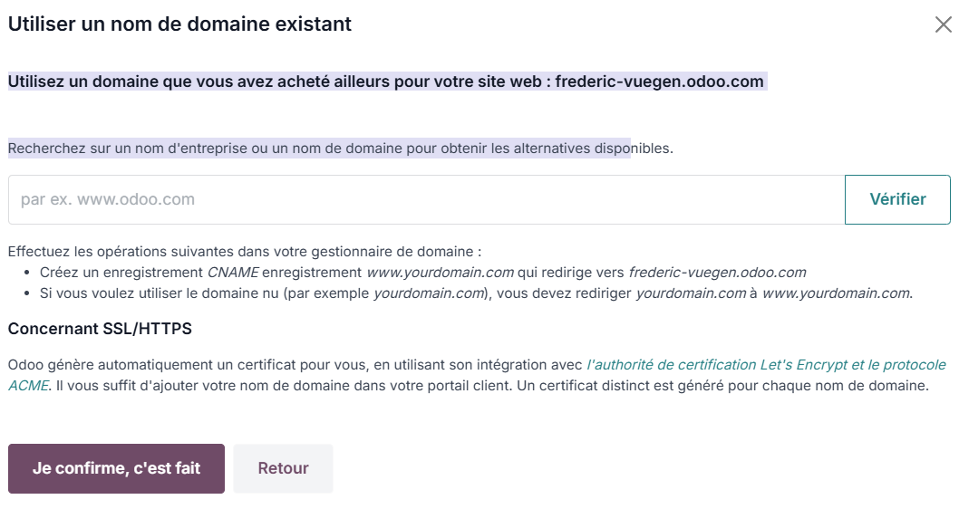 - Mentionner votre domaine et vérifier celui-ci avant de confirmer