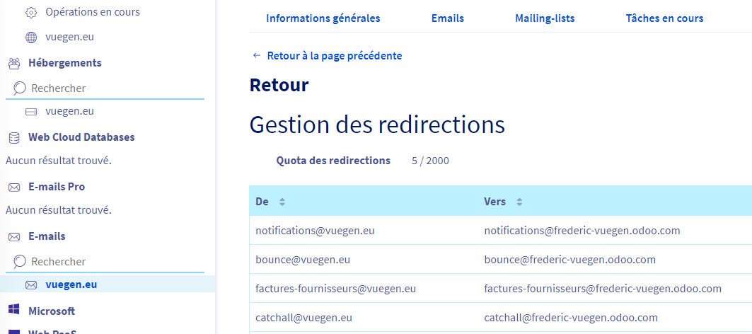 - Créer des redirections pour les mails entrants sur OVH dans "Gestion des redirections" de E-mails